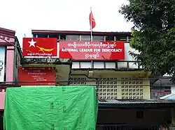 Post-coup, NLD offices were occupied and raided by police authorities, starting on 2 February.[42] Documents, computers and laptops were forcibly seized, and the NLD called these raids unlawful.[42] On 9 February, police raided the NLD headquarters in Yangon.[43] On 21 May 2021, the junta-controlled Union Election Commission (UEC) announced plans to permanently dissolve the NLD,[44] though the junta later reversed this decision, with spokesman Zaw Min Tun saying that the NLD will decide whether to stand in the next general election.[45] After the junta enacted a new electoral law in January 2023 designed to favor the Union Solidarity and Development Party (USDP), the military's electoral proxy, the NLD announced it would not re-register as a political party and would not recognize the results of any election held by the junta.[8] On 28 March 2023, the UEC dissolved the NLD, which, in turn, challenged the decision saying that the UEC has no legitimacy as the junta itself "is by no means legal".[46]
