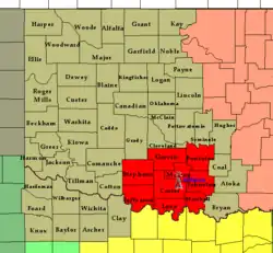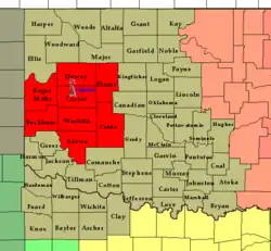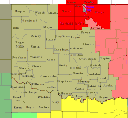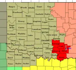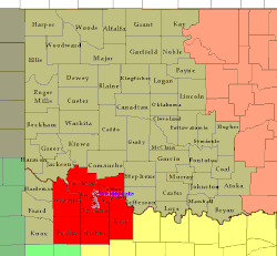 The Norman Weather Forecast Office – which operates as a branch of the National Weather Service's Southern Region Headquarters (SRH) division – manages three NEXRAD (WSR-88D) Doppler weather radar sites that cover its area of forecasting responsibility, based in Oklahoma City (radar identification code: TLX), serving central Oklahoma; Frederick (FDR), serving southwestern Oklahoma and western north Texas; and at Vance Air Force Base (VNX), serving north-central and northwestern parts of Oklahoma, and portions of southern Kansas.[2] The office has earned widespread recognition from local media outlets, especially in concern with certain weather conditions that are or are forecast to occur.[3][4] It has also received attention from national media, and was even recognized by United States President Barack Obama.[5][6][7]