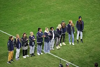 At the 2022 NWSL Championship, the league recognized players who had competed in the league for all ten years of its existence. Left to right: Nicole Barnhart, Alyssa Mautz, Lauren Barnes, Jess Fishlock, Toni Pressley, Merritt Mathias, Jasmyne Spencer, McCall Zerboni, Alyssa Naeher, Tori Huster, Jessica McDonald. Not shown: Ashlyn Harris, Ali Krieger, Sydney Leroux, Allie Long, Kristie Mewis, Alex Morgan, Kelley O'Hara, Megan Rapinoe, Becky Sauerbrunn, Christine Sinclair.[15]