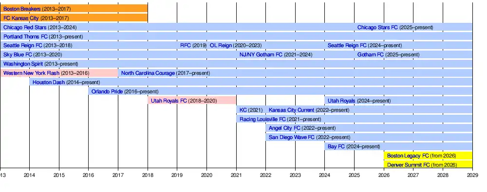 The NWSL was established in 2012 as the successor to Women's Professional Soccer (WPS; 2007–2012), which was itself the successor to the Women's United Soccer Association (WUSA; 2000–2003). The league began play in 2013 with eight teams, four of which were former members of WPS (Boston Breakers, Chicago Red Stars, Sky Blue FC, and Western New York Flash).[5][6][7]