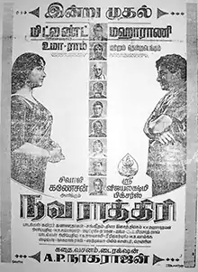 Navarathri (transl. Nine nights) is a 1964 Indian Tamil-language drama film written, produced and directed by A. P. Nagarajan. The film stars Sivaji Ganesan and Savithri. It was the hundredth film of Ganesan and is well known for his nine distinct roles.[1] The film, released on 3 November 1964, become a box-office hit, with theatrical run of 100 days.[2][3] It was remade in Telugu as Navaratri (1966) and in Hindi as Naya Din Nai Raat (1974).