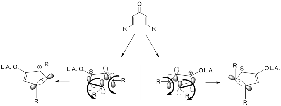 As noted above, variants that deviate from this template are known; what designates a Nazarov cyclization in particular is the generation of the pentadienyl cation followed by electrocyclic ring closure to an oxyallyl cation. In order to achieve this transformation, the molecule must be in the s-trans/s-trans conformation, placing the vinyl groups in an appropriate orientation. The propensity of the system to enter this conformation dramatically influences reaction rate, with α-substituted substrates having an increased population of the requisite conformer due to allylic strain. Coordination of an electron donating α-substituent by the catalyst can likewise increase the reaction rate by enforcing this conformation.[2]