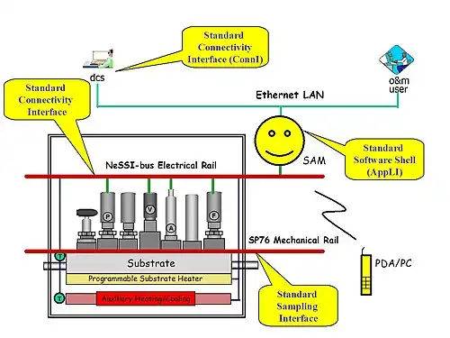 To date, NeSSI has served as a forum for the adoption and improvement of an industrial standard which specifies the use of miniature and modular Lego-like flow components. NeSSI has also issued a specification which has been instrumental in spurring the development and commercialization of a plug and play low power communication bus (NeSSI-bus) specifically designed for use with process analytical sample systems in electrically hazardous environments. As part of its development road map, NeSSI has defined the electrical and mechanical interfaces, as well as compiled a list of automated (smart) software features, which are now beginning to be used by microanalytical manufacturers for industrial applications.