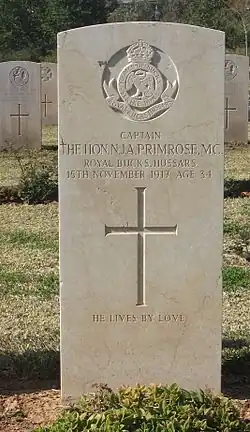 Primrose was commissioned into the Buckinghamshire Yeomanry (Royal Bucks Hussars) in 1909.[7] Promoted Captain in 1915, he was awarded the Military Cross in the King's Birthday Honours of June 1916.[8] He died in November 1917 from wounds received in action at Gezer during the Sinai and Palestine Campaign while leading his squadron of the 1/1st Royal Buckinghamshire Yeomanry against Turkish positions on the Abu Shusheh ridge during the Third Battle of Gaza.