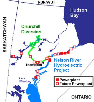 One of the key elements of the Nelson project was the diversion of much of the Churchill River into the Nelson watershed. The 1,600-kilometre-long (1,000 mi) Churchill River originates in northern Alberta and drains into Hudson Bay at Churchill, Manitoba. Currently the Missi Falls Control Structure (57°20′34″N 98°08′17″W / 57.3427°N 98.1381°W) at the mouth of South Indian Lake reduces the flow of the Churchill River to 15% of its natural flow.[6] This causes South Indian Lake to rise 3 metres (9.8 ft), as opposed to the 10.6 metres (35 ft) envisioned in the original plan.[6][7] The diverted water flows through the 9.3 km (5.8 mi) South Bay Diversion Channel into the Rat River, which is in the Nelson River watershed.[8] The outflow of Rat River into the Burntwood and subsequently Nelson River is controlled by the Notigi Control Structure.[8](55°51′37″N 99°19′51″W / 55.8604°N 99.3308°W)
