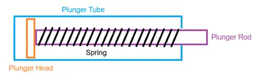 The direct plunger system consists of a few main components, including a tube, a spring, and a rod with a head attached to the spring. To cock this mechanism, the user must move a handle attached to the rod in a rearward motion to compress the spring and lock it in place. When the user pulls the blaster's trigger, the lock disengages, which causes the spring to release and force air out through the tube in the direction of the spring's release. The energy generated by the compressed air, in turn, launches the dart or other projectile out through the blaster's barrel apparatus.[1]