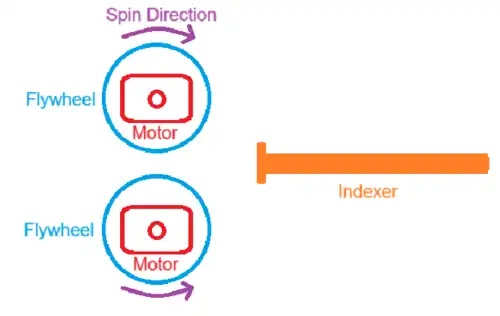 While most plunger systems in modern Nerf blasters rely on the user to move a handle or other component rearward to store energy in a spring, Hasbro designs most blasters' flywheel systems using battery-driven motors as the effective propulsion method. In these systems a pair of motors spins two opposing wheels, each in the direction of the barrel, in order to impart momentum onto the projectile. To perform this action, the user pulls the blaster's trigger to actuate a mechanical or electronic indexer, which feeds a dart or other projectile into the spinning wheels. The wheels, in turn, apply friction to the dart or other projectile to launch the ammo out through the barrel mechanism.[5]