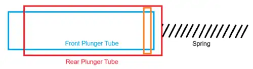 The reverse plunger system operates similarly to the direct plunger mechanism, but there are some notable differences in the system's design. While a direct plunger system uses a rod with a head to propel air into the projectile, a reverse plunger system replaces this component with a rear tubular portion that slides backward to pull air into the system. To cock the mechanism, the user pulls a handle attached to this rear tube backward, which compresses the spring connected to the rear tube and pulls air into the front tube. Like the rod in the direct plunger, this motion engages a catch that locks the rear tube in place. Upon squeezing the trigger, the user disengages this catch, which springs the rear tube forward. As the tube returns forward, air pressure builds in the front tube and discharges the dart or other projectile from the blaster's barrel.[4]