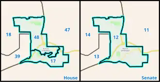 Example of nested districts in the Wyoming Legislature. The city of Rock Springs is split into northern and southern state house districts, but they are both combined into a single state senate district.