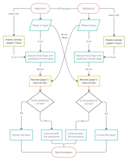 Unlike a local game where the inputs of all players are executed instantly in the same simulation or instance of the game, in an online game there are several parallel simulations (one for each player) where the inputs from their respective players are received instantly, while the inputs for the same frame from other players arrive with a certain delay (greater or lesser depending on the physical distance between the players, the quality and speed of the players' network connections, etc.).[3] During an online match, games must receive and process players' input within a certain time for each frame (roughly 17 ms per frame at 60 FPS), and if a remote player's input of a particular frame (for example, of frame number 10) arrives when another one is already running (for example, in frame number 20, roughly 170 ms later), desynchronization between player simulations is produced. There are two main resolutions to this conflict implemented in modern games: delay-based and rollback-based resolution.
