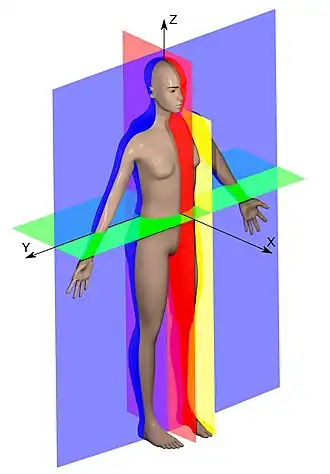 ![]() The main anatomical planes of the human body, including median (red), parasagittal (yellow), frontal or coronal plane (blue) and transverse or axial plane (green). | |