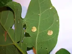 The fly Clinodiposis galliperda is often found as an inquiline within the agamic 'smooth spangle gall' generation.[3]