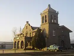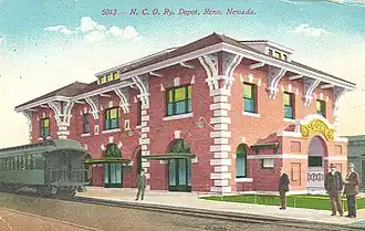 The Nevada–California–Oregon Railroad built classic brick depots in Reno and Lakeview. A smaller stone masonry station was constructed in Alturas.[2] All three passenger depots still exist, and are listed on the United States National Register of Historic Places along with the locomotive house and machine shop in Reno.[10] The N-C-O railway office in Alturas and the depot at Lakeview are examples of the 1880s style of architecture known as Mission Revival. The features include solid massive walls with buttressing, broad unadorned wall surfaces, wide projecting eaves, low-pitched tile roofs, corridors with Roman aqueduct-like arches, terraced bell towers and mission belfry facades. (See The Journal of the Modoc County Historical Society, No. 11, 1989.) The style showed up at Stanford University, the Southern Pacific depot in Santa Barbara and the Mission Inn in Riverside. The architect for many N-C-O buildings was Carl Werner of San Francisco. However, he did not design the railroad's three main depots.