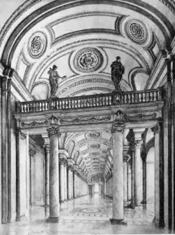 Inside, Hoffmann divided the building into a stage section and an audience section. The audience section forms the center of the building, with a large staircase and a foyer in front of it. Four atriums further divide the building. The central entrance was to be located on Königsplatz, through which one was to enter a transverse vestibule that was to occupy the entire width of the building. A few steps lead to the central staircase or the side corridors. A wide staircase in the central stairwell and further stairs in the side corridors lead to the first tier, and two staircases behind the main hall lead to the upper stalls. The auditorium was to consist of four tiers, spanned by additional rows of seats in the style of an amphitheater; the ceremonial box and the three-part proscenium boxes were architecturally emphasized. A large foyer was to be set up above the entrance hall for breaks, and other common rooms were located throughout the building.