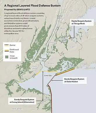 The proposal was developed in the wake of Hurricane Sandy by the Metropolitan NY-NJ-LI Storm Surge Working Group (SSWG), composed of prominent civic leaders, social scientists, oceanographers, engineers, and architects. The group is chaired by Malcolm Bowman, a professor of physical oceanography at the State University of New York at Stony Brook.[3][4] Within the proposed barrier system lies crucial infrastructure such as the seaports and maritime facilities; ground-level and underground transportation terminals; three major international airports; subway and roadway tunnels; hospitals; communication centers; the industrial complex of northern New Jersey; as well as the millions of residents at risk in New York City and coastal New Jersey north of Sandy Hook.[5]
