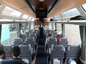 With large panoramic windows and quarter lights in the roof, the area of glass per AK car is 52 m2 (560 sq ft). To one side of each seat is a jack for headphones for the on-board commentary, and in front of each seat is a flip-down tray table. Seats facing each other in groups of four are positioned around a fixed table. Power points are provided at each seat area. Carry-on baggage can be stored overhead.
