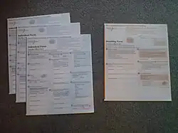 Forms that were intended for the (cancelled) 2011 census. At left, the forms for individual persons surveyed; at right, a form for the overall household. The 2013 census forms were identical, save for the dates.