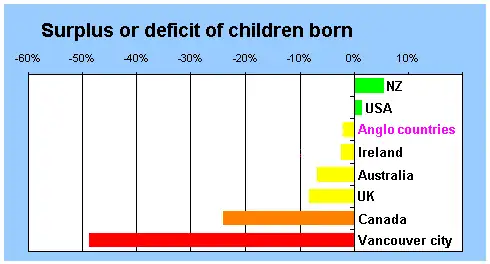 Having children sustains culture and is good for the economy. Overall Anglo countries have enough children to be approximately sustainable. New Zealand and the United States produce a slight surplus of children, while Ireland, Australia and the UK have modest deficits.