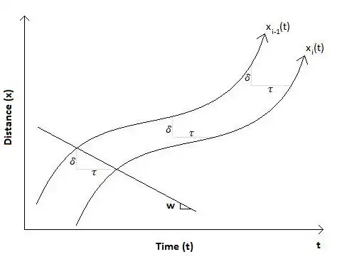 In the time-space diagram, the trajectories of the leading (top) and following (bottom) vehicle are separated by the distance δ and time τ. The spacing between vehicles at traffic state A can be found using a geometric relationship found in the time-space diagram: