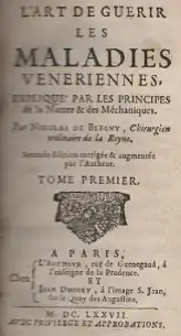 L'Art de guérir les maladies vénériennes, Paris, at the author and Jean Dhoury. 1677