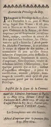 Extract from King Louis XIV's privilege dated 1674, in fine of the book L'art de guérir les maladies vénériennes