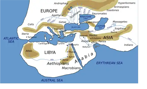 Reconstruction of the Oikoumene (inhabited world), an ancient map based on Herodotus' description of the world, c. 450 BC