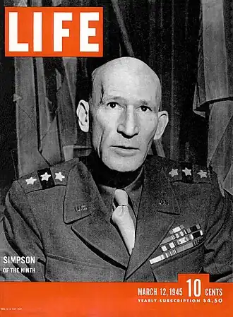 In November, Ninth Army was shifted to the very northern flank of 12th Army Group. It undertook operations to close the front up to the Roer River. 16 December saw the opening of the last great German offensive of the war, the Battle of the Bulge. Ninth Army was isolated from the headquarters of 12th Army Group, and it was thus placed (on 20 December[1]) under the command of General Bernard Montgomery's 21st Army Group along with First Army, despite opposition from General Omar Bradley. Simpson reoriented his command quickly to help in the reduction of the salient that the Germans had created. Many of Ninth Army's units passed to the command of First Army, which was doing the main work of reducing the German salient from the north. In the meantime, the remainder of Ninth Army continued to hold the line along the Roer. When First Army and Third Army had finished reducing the salient, First Army returned to the command of 12th Army Group, but Ninth Army remained under the command of 21st Army Group for the remainder of the Rhineland Campaign.