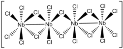 In the solid state, niobium(IV) chloride exists as chains of edge-sharing octahedra with alternating Nb-Nb distances of lengths 302.9 and 379.4 pm. The shorter distances correspond to Nb-Nb bonds, which result in the compound's diamagnetism. Its structure is very similar to that of tungsten(IV) chloride.