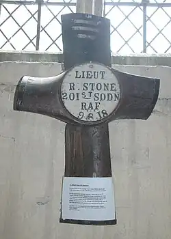 Monument made from an aircraft propeller in St Nicholas' parish church, Piddington, Oxfordshire, to Lt. Richard Stone, a 201 Squadron Sopwith Camel pilot killed in action in France on 9 August 1918