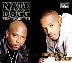 "Nobody Does It Better" is a song by American singer-songwriter Nate Dogg, featuring vocals from rapper Warren G. It was released in June 1998 as the second single from Nate Dogg's debut studio album G-Funk Classics, Vol. 1 & 2 (1998).[1] The song was produced by Warren G, and samples and contains an interpolation from "Let's Get Closer" by Atlantic Starr.[2] The song was later sampled by rapper G Herbo in his song “No Jail Time” from his 2021 album “25”