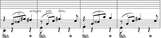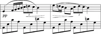 In bars 58 through 61, there are 4 different tuplets; an 18-tuplet, a 35-tuplet, an 11-tuplet, and a 13-tuplet, all of which run through the E major scale. The piece ends in ppp with a high and low C♯.