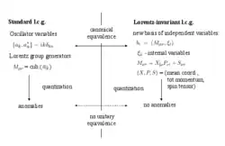 Algebraically this corresponds to a canonical transformation ai -> bi in the classical mechanics to a new set of variables, explicitly containing all necessary generators of symmetries. For the standard light cone gauge the Lorentz generators Mμν are cubic in terms of oscillator variables ai, and their quantization acquires well known anomaly. Consider a set bi = (Mμνi) which contains the Lorentz group generators and internal variables ξi, complementing Mμν to the full phase space. In selection of such a set, one needs to take care that ξi will have simple Poisson brackets with Mμν and among themselves. Local existence of such variables is provided by Darboux's theorem. Quantization in the new set of variables eliminates anomaly from the Lorentz group. Canonically equivalent classical theories do not necessarily correspond to unitary equivalent quantum theories, that's why quantum anomalies could be present in one approach and absent in the other one.