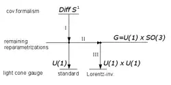 Group-theoretically string theory has a gauge symmetry Diff S1, reparametrizations of a circle. The symmetry is generated by Virasoro algebra Ln. Standard light cone gauge fixes the most of gauge degrees of freedom leaving only trivial phase rotations U(1) ~ S1. They correspond to periodical string evolution, generated by Hamiltonian L0. Let's introduce an additional layer on this diagram: a group G = U(1) x SO(3) of gauge transformations of the world sheet, including the trivial evolution factor and rotations of the gauge axis in center-of-mass frame, with respect to the fixed world sheet. Standard light cone gauge corresponds to a selection of one point in SO(3) factor, leading to Lorentz non-invariant parametrization. Therefore, one must select a different representative on the gauge orbit of G, this time related with the world sheet in Lorentz invariant way. After reduction of the mechanics to this representative anomalous gauge degrees of freedom are removed from the theory. The trivial gauge symmetry U(1) x U(1) remains, including evolution and those rotations which preserve the direction of gauge axis.