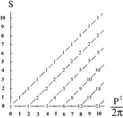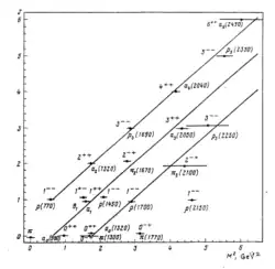 Experimental spin-mass spectrum of light mesons superimposed with prediction of string model.[6][7]