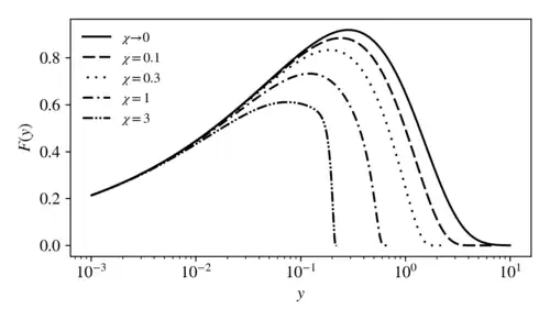 where the parameter , is now defined as:The result is similar to the classical one except for the different expression of . For it reduces to the classical spectrum (2). Note that if ( or ) the spectrum must be zero because the energy of the emitted photon cannot be higher than the electron energy, in particular could not be higher than the electron kinetic energy .[13]