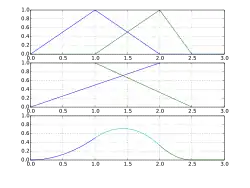 From top to bottom: Linear basis functions (blue) and (green) (top), their weight functions and (middle) and the resulting quadratic basis function (bottom). The knots are 0, 1, 2, and 2.5.