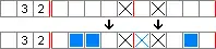 Consequently, the first block of four boxes definitely includes the third and fourth cells, while the second block of three boxes definitely includes the eighth cell. Boxes can therefore be placed in the third, fourth and eighth cells. When determining boxes in this way, boxes can be placed in cells only when the same block overlaps; in this example, there is overlap in the sixth cell, but it is from different blocks, and so it cannot yet be said whether or not the sixth cell will contain a box.