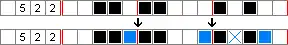 For example, considering a row of fifteen cells with boxes in the third, fourth, sixth, seventh, eleventh and thirteenth cell and with clues of 5, 2 and 2: