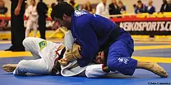 In combat sports, the north–south position (also known as north/south or four quarter) is a ground grappling position where one combatant is supine, with the other combatant invertedly lying prone on top, normally with their head over the bottom combatant's chest. The north–south position is a dominant position, where the top combatant can apply effective strikes such as knee strikes to the head, or easily transition into various grappling holds or more dominant positions. Transitioning into side control can be done by first switching into a particular hold known as ushiro-kesa-gatame (後袈裟固) or reverse scarf hold, where the chest points to the side, and the opponent's arm is controlled similarly to kesa-gatame. The north–south choke is employed exclusively from this position.