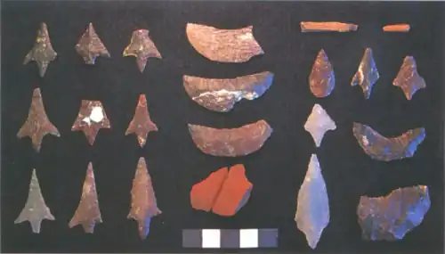 Projectile weapons have the great disadvantages of limiting their use and breaking often. But, as stated earlier, the abundance of local materials meant that a brand new dart or arrow could be made quickly and cheaply. This also produced an interesting trend in technology. The Clovis tipped spears of the Paleo-Natives required a remarkable amount of skill and familiarity with the material. Each spear head had a great deal more care and skill taken in its creation. The larger size and persistence to the user meant that the user also cared a great deal more about its quality. Many of the Clovis tips surviving today have remarkable characteristics that only a truly experienced individual could create. Many of the marks on the Clovis tips are done with a single blow. Being that these are from larger rocks and less expendable, it is safe to assume there was a relatively low failure rate concerning the probability of error. One would have to assume that a great deal of familiarity was present in the craftsmen about the physical characteristics of the local rocks. The smaller, flying weapons of the Archaic age meant less time and care was taken into the tips, and with this habit, there became less familiarity with the rocks. Also, the habitual migration and interaction with others meant trade happened more often. The complexity, and quality of the Clovis tips was relatively quickly replaced by the cheaper, inferior tips of the Archaic age. Although this style was obviously more efficient, it is interesting to see the devolution of material craftsmanship brought about from the change in climate and lessening concern for scarcity. One of the most common projectile weapons used was the atlatl, or spear-thrower. Unlike other projectile weapons, the atlatl could throw projectiles with greater force and accuracy than could be achieved by hand. In addition to harpoon-tipped spears, California Natives in the coasts also used a variety of other projectile weapons for hunting fish, including bows and arrows. These weapons were typically made from wood and had specialized arrowheads designed for hunting in water.[3]