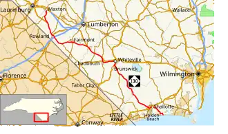 NC 130 was established around 1928 as a renumbering of part of NC 201 between NC 30 in Supply, to the intersection of Moore Street and Atlantic Avenue in Southport. In 1930, NC 130 was extended west along NC 30 to Shallotte, then northwest along new primary routing to NC 23 near Whiteville.[2] In 1940, NC 130 made its final westward extension, by overlapping with US 701 to US 74 in Whiteville; in concurrency, it travels with US 74 until Boardman, then replaced NC 71 through Fairmont and Rowland before ending at US 74/NC 71 in Maxton.[3]