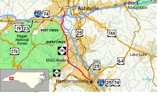 NC 191 begins at an intersection with US 25 Business / Asheville Highway in the city of Hendersonville in Henderson County. Named Haywood Road, it travels northwest from Hendersonville and enters the town of Mills River, where it meets NC 280 (Boylston Highway). NC 191 runs concurrent with NC 280 northward for a short distance before separating after approximately 1 mile (1.6 km).[1] The route continues north towards Asheville, leaving Henderson County and entering Buncombe County, before meeting the western terminus of NC 146 (Long Shoals Road) in the community of Avery Creek. Past Avery Creek, NC 191 intersects the scenic Blue Ridge Parkway, a National Parkway and All-American Road. The highway continues north into Venable, intersecting the eastern terminus of NC 112 (Sardis Road) and then I-26 and US 74 at exit 33 as it reaches the outermost city limits of Asheville. Entering the city, NC 191 interchanges with I-40 (exit 47) and one-half mile (0.80 km) later, with I-26/I-240 (exit 1B). NC 191 heads into the southwestern section of Asheville named Brevard Road. At just over 21.5 miles (34.6 km), the route reaches its northern end at US 19 Business/US 23 Business (Haywood Road).[1][2]