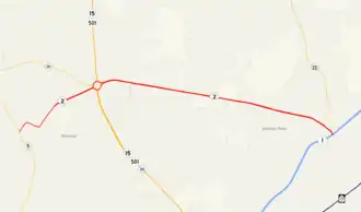 NC 2 begins at an intersection with NC 5 (Beulah Hill Road), just south of downtown Pinehurst. The route follows Cherokee Road to the northeast through a residential section of the town before meeting a traffic circle. Continuing across the circle the road continues to follow Cherokee Street until meeting Azalea Road. At the intersection the street name changes to Azalea Road, and begins a turn toward the southeast. NC 2 turns northeast onto Palmetto Road near the Pinehurst Golf Course. It continues to follow Palmetto Road along the western side of the golf course. Palmetto Road turns slightly to the northeast before widening to a 4 lane road and becoming Midland Road. NC 2 meets up with US 15/US 501 and NC 211 at a traffic circle east of a shopping district. The road continues straight across the circle and continues on Midland Road. Midland Road crosses through a residential area west of Pinehurst before entering into the town of Southern Pines. NC 2 turns to the southeast before intersecting the southern terminus of NC 22 at Central Drive. The road then crosses McDeeds Creek before reaching its eastern terminus at an interchange with US 1.[1][2]