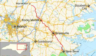 In 1987, NC 43 was extended south of Vanceboro along US 17 Business and US 17 to Weyerhaeuser Road. Traveling along Weyerhaeuser Road, it connects and overlap with NC 55 going into New Bern; then with US 70 Business and southward to US 70 and US 17. The resulting new routing made a western rural bypass of New Bern.[5] In 1998, NC 43 was rerouted onto new connector in downtown Rocky Mount.[6] In 2001, NC 43 was rerouted onto northern bypass route around Rocky Mount, leaving behind NC 43 Bus.[7] In 2009, NC 43 was rerouted onto new road between NC 55 and US 17/US 70, eliminating its routing through New Bern.[8]