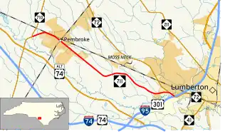 North Carolina Highway 711 (NC 711) is a primary state highway in the U.S. state of North Carolina. It connects the town of Pembroke with Interstate 95 (I-95) and U.S. Route 301 (US 301) in Lumberton. The highway travels in an east-to-west orientation but is signed as a north-south highway (with its easternmost point in Lumberton as its southern terminus), entirely in Robeson County.