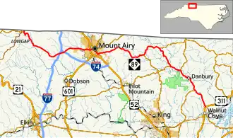 North Carolina Highway 89 (NC 89) is a 61.3-mile-long (98.7 km) primary state highway in the U.S. state North Carolina including Mount Airy and Danbury. The entire route spans only two counties in the state: Surry and Stokes. It can be accessed from the Blue Ridge Parkway via Virginia's State Route 89 (the highway that continues from NC 89's western terminus) or an interchange with NC 18 which intersects NC 89 near its western terminus. Interstates 74 and 77 both intersect NC 89 west of Mount Airy.