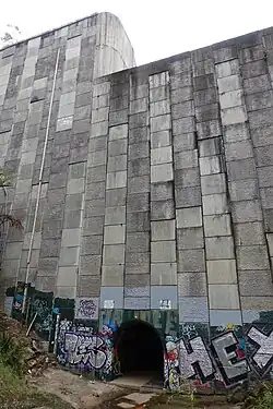 North Rocks was once considered as the haunt of convict bolters and bushrangers and regarded as an unsavoury area. One noted incident was the hold-up of Dr Sherwin in 1830 by John Macnamara and William Dalton, which resulted in the ex-convicts' demise.[4] The North Rocks were a massive sandstone outcrop, which terminated the ridge on the south side of Hunts Creek. These rocks so dominated the landscape and were such prominent features that they gave their name to the locality but were not preserved.[5] In 1841 when it was decided to build a new gaol at Parramatta, a contractor bought the Rocks as they consisted of the best sandstone in the district - and were very conveniently situated. His tender was accepted, and much of the North Rocks became gaol walls and flagstones in 1844. Further inroads were made on what was left when the wall of masonry was erected in 1855-56 which held back the waters of Lake Parramatta. Much stone was needed for the dam, as the wall is about 240 feet (73 m) long and is fifteen feet thick at the base.[6]