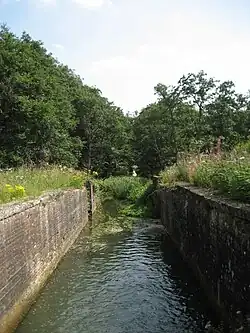 Continuing to the north west, the canal reaches Spa Common, to the east of North Walsham, where a narrow, humpbacked, grade II listed bridge carries Anchor Road over the waterway.[46] The mill lies to the north of the bridge, awaiting a water supply. There is a footpath along the left bank of the channel most of the way to Royston Bridge, the only bridge to be culverted. To the north of the bridge is the Mike Thurston Water Activities Centre, where young people camp and learn water skills.[47] There is a footpath along the route of the canal from the culvert to Pigneys Wood. The canal was then crossed by the railway from North Walsham Town to Sheringham. The piers remain, and a bowstring bridge carries pipes across the gap, but the footpath which follows the trackbed descends to the level of the canal and crosses it on a wooden footbridge.[48] The route continues westwards, past the two Swafield locks, the lower one of which is still watered, and is crossed by another grade II listed bridge at Bradfield,[49] before reaching the terminus, just below Antingham ponds.[40]