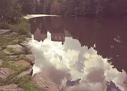 North Woods contains the Loch, which drains into Harlem Meer in the northeastern corner of the park; the Loch is fed by the Pool, whose mouth is the waterfall at its eastern end that is the source of the Loch, just west of the arch called Glen Span.[37] The Loch and Pool are adapted from a single watercourse called Montayne's Rivulet, originally fed from a natural spring but now replenished by the city's water system.[5]: 48–49 [53] The Loch is the only stream in Central Park where an existing watercourse was left aboveground, rather than placed in a culvert underground.[5]: 48–49