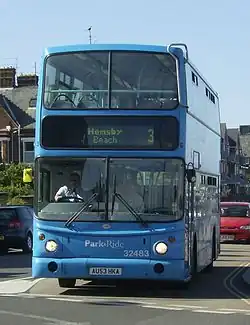 The Norwich Park and Ride is a park & ride bus service in the English city of Norwich, East Anglia. The first of the park and rides was opened in the early 1990s at Norwich Airport in Hellesdon,[1] while the sixth and final site was opened in Thickthorn in 2005.[2] With the addition of the final site, the Norwich Park & Ride became the largest park and ride services in the United Kingdom,[3] and provided the scheme with over 5,000 permanent parking spaces – at the time the highest number for a park and ride scheme in the country.[2] The scheme was awarded the British Parking Association Park and Ride award in 2004,[3] and in the 2006/2007 financial year, 3.3 million people used the service, keeping 940,000 cars out of the city centre.[4]